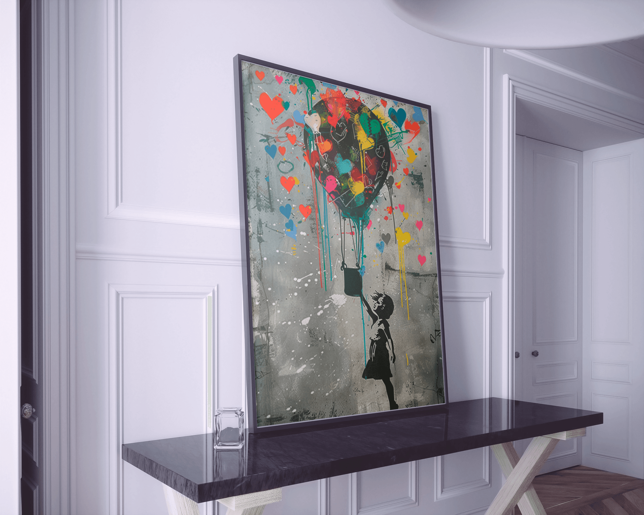 Celebrate dreams, resilience, and fearless imagination with this stunning Banksy-inspired Girl with Heart Balloon Wall Art print. Featuring a young girl floating upward, clutching a vibrant balloon made of multicoloured hearts against a textured graffiti backdrop, this artwork captures the emotional depth and bold urban spirit of street art’s most iconic style.