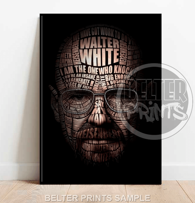 “I am the one who knocks.” This Breaking Bad wall art is a masterpiece of typography, building Walter White’s face entirely from the words that made him a legend. From his infamous monologues to his chilling transformation into Heisenberg, every line is etched into this striking design. Dark, gritty, and powerful — a must-have for fans of one of TV’s greatest shows.