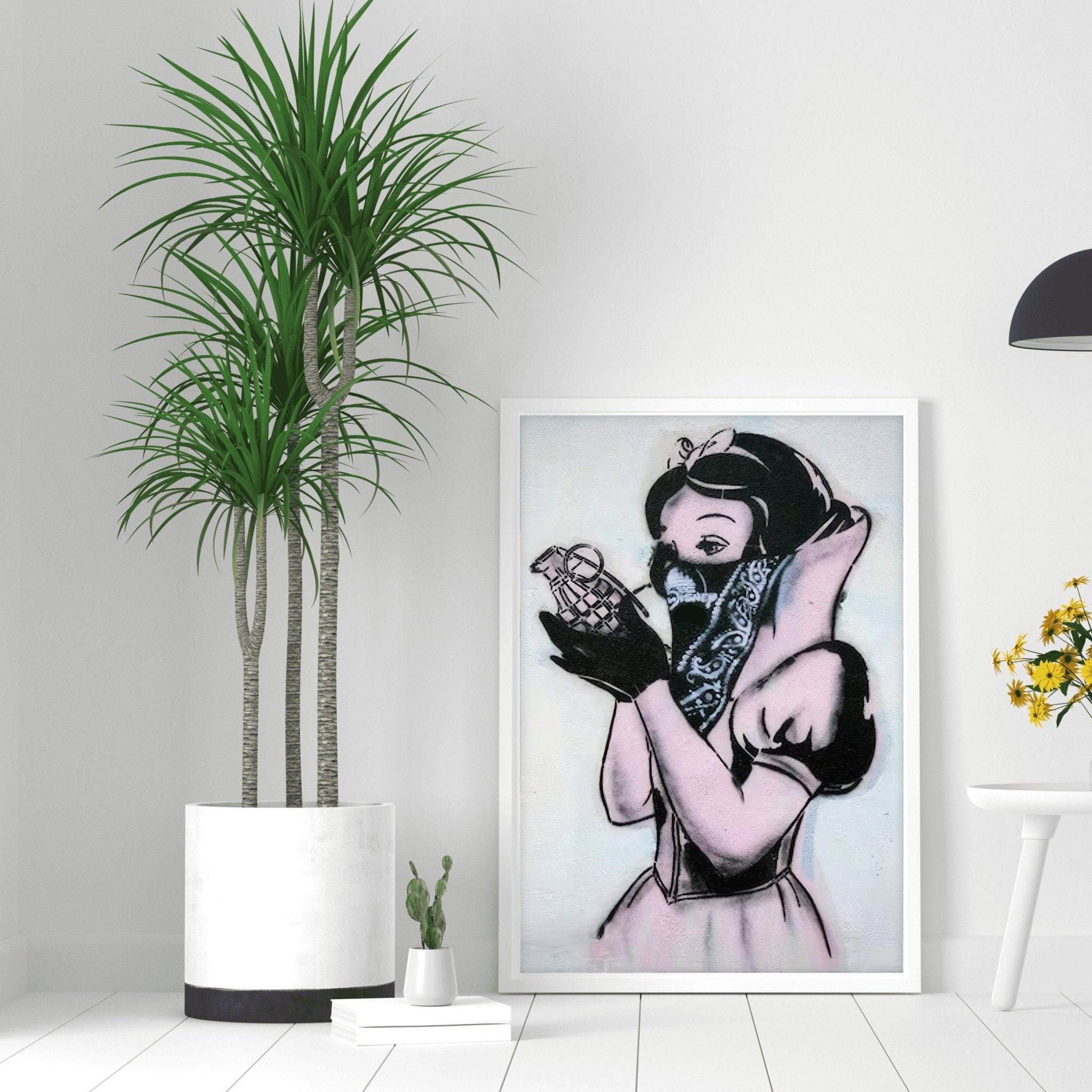 'Cinderella Revolution – Banksy-Inspired Wall Art Print' captures the gritty soul of rebellion with a wink — blending satire, street wit, and subversive genius. This print doesn’t just hang on your wall — it speaks from it. Inspired by Banksy’s renegade spirit and designed to disrupt the ordinary, this is a premium-quality fine art print made for rule-breakers.