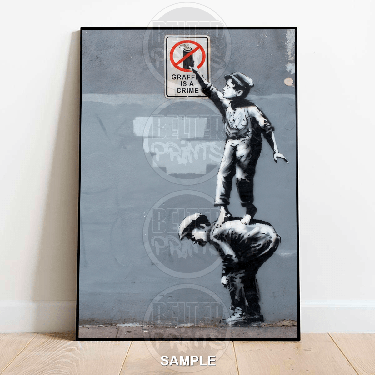 What happens when rebellion becomes the crime? Crime of Art is a Banksy-inspired stencil that flips authority on its head — two boys working together to deface a “Graffiti is a Crime” sign. Stark monochrome figures against a muted backdrop deliver the perfect dose of irony, wit, and defiance.