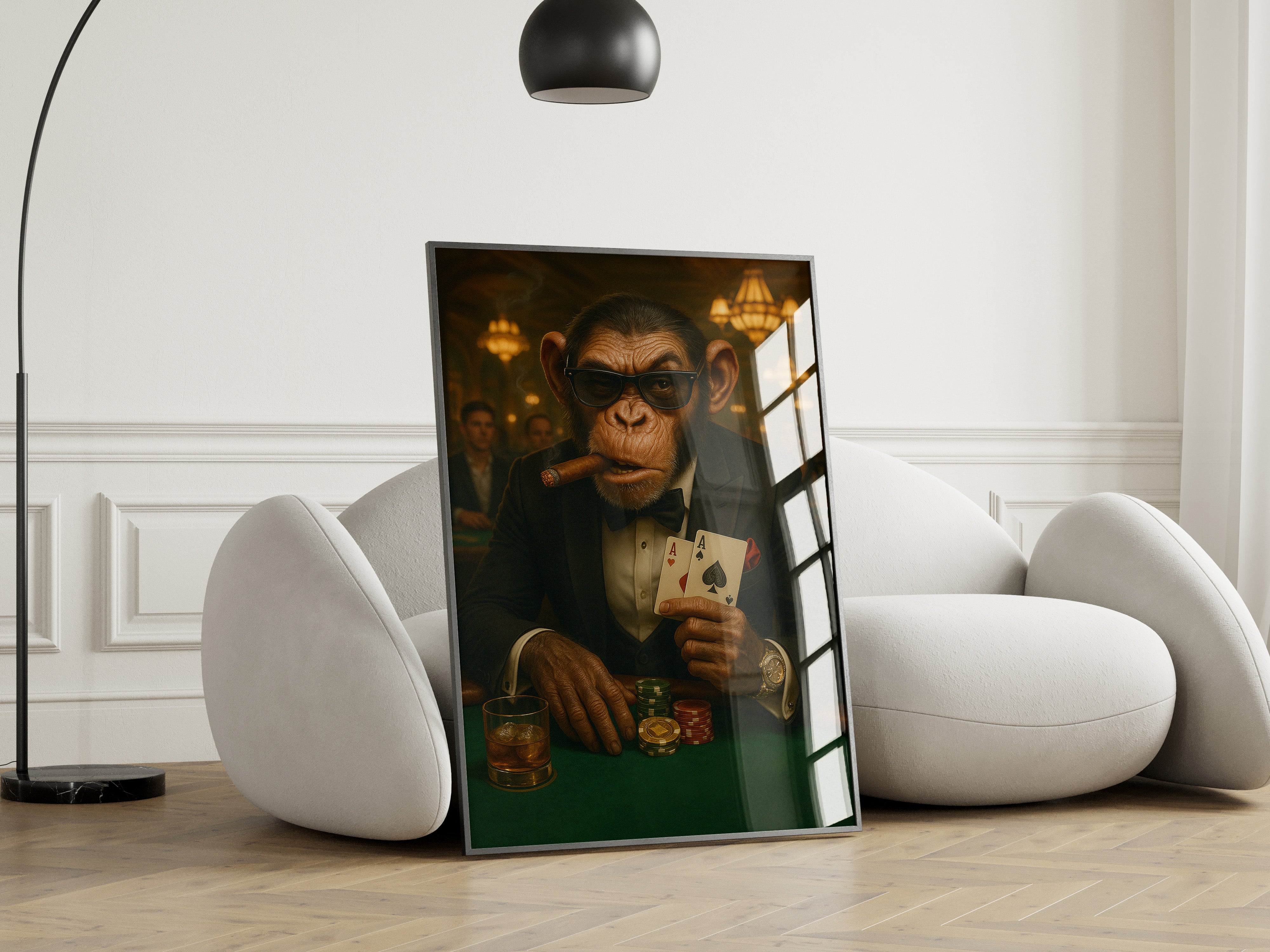 Meet the sharpest player in the room — a chimp in a tux, cigar in mouth, holding pocket aces like he owns the table. This Poker Monkey wall art is pure swagger: the smoke-filled casino glow, the stack of chips, the ice-cold whisky — every detail screams power, humour, and high-stakes energy. Perfect for gamblers, poker lovers, and anyone who plays life with a smirk and a winning hand.