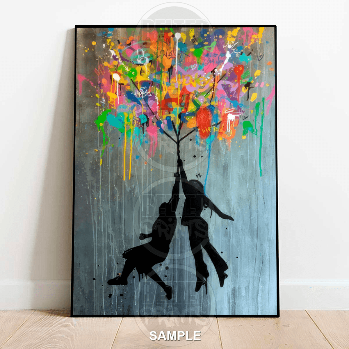 Defy gravity with paint. Lifted By Colour takes the raw stencil style of Banksy and collides it with a burst of dripping rainbow chaos. Two silhouetted children cling to a spray-painted bouquet of balloons, rising upward into a storm of colour.