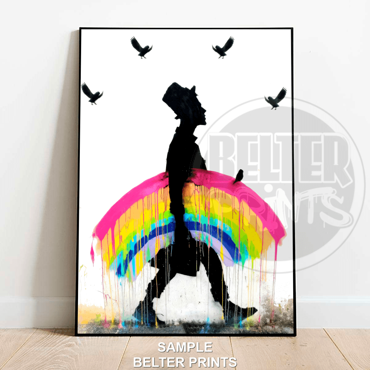 Dark meets bright in Rainbow Stroll, a Banksy-inspired wall art print that fuses grit with irony. A faceless silhouette in a top hat strides forward, cloaked in a dripping rainbow that cuts through the grey. Above him, black crows circle — symbols of shadow, chaos, and contrast against the vibrancy below.